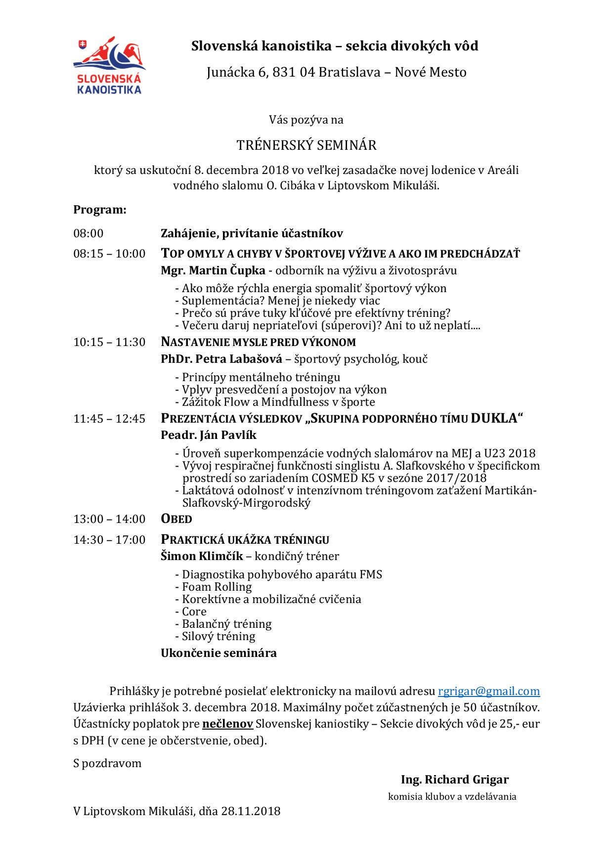 Dovedna 55 účastníkov z jednotlivých klubov sekcie, si obohatilo svoje vedomosti z oblasti športovej výživy, či športovej psychológie, zoznámili sa s výsledkami diagnostiky špičkových vodných slalomárov a ich využitím pri plánovaní tréningových jednotiek, absolvovali praktickú ukážku diagnostiky pohybového aparátu, balančného a silového tréningu, ako aj korektívnych a mobilizačných cvičení.